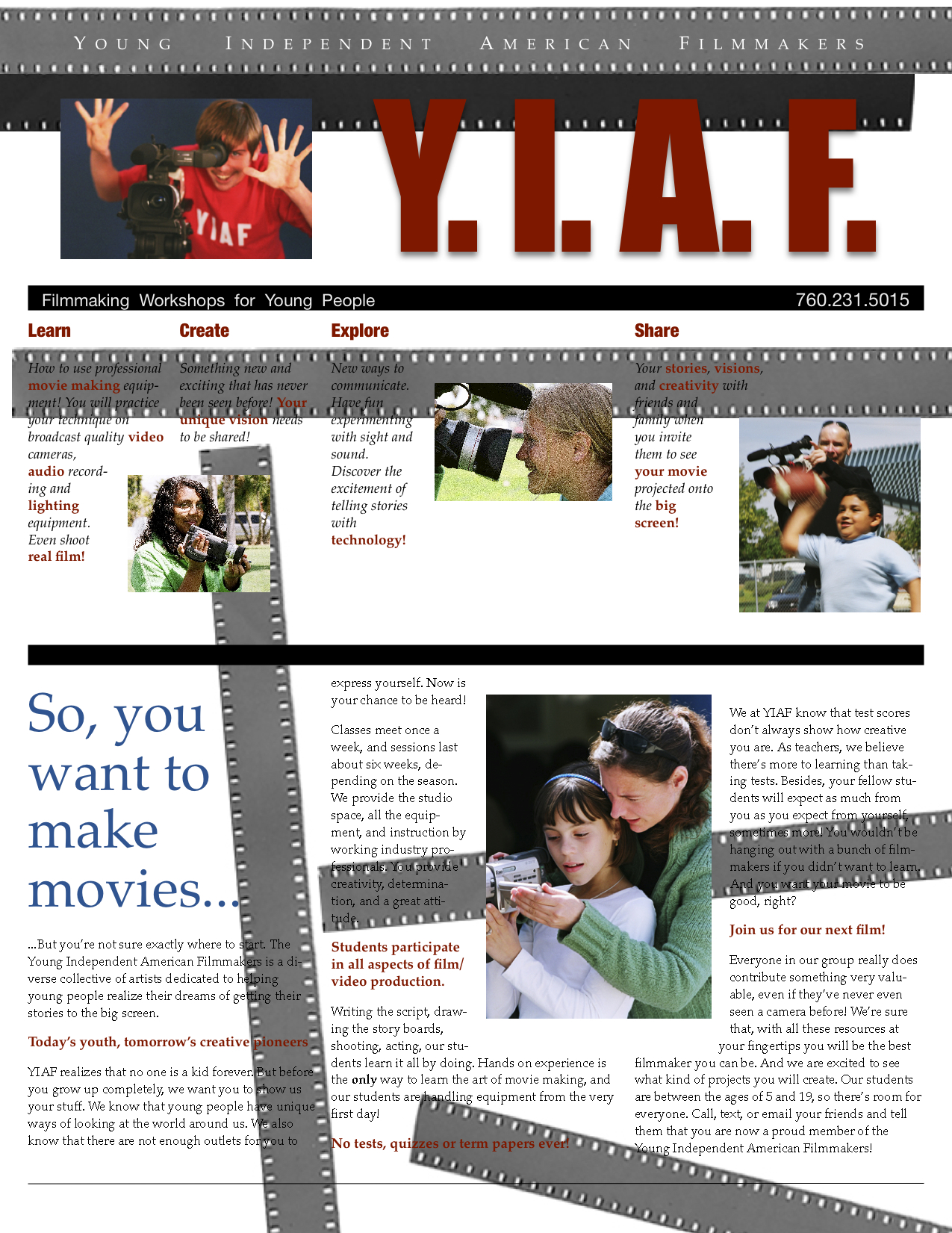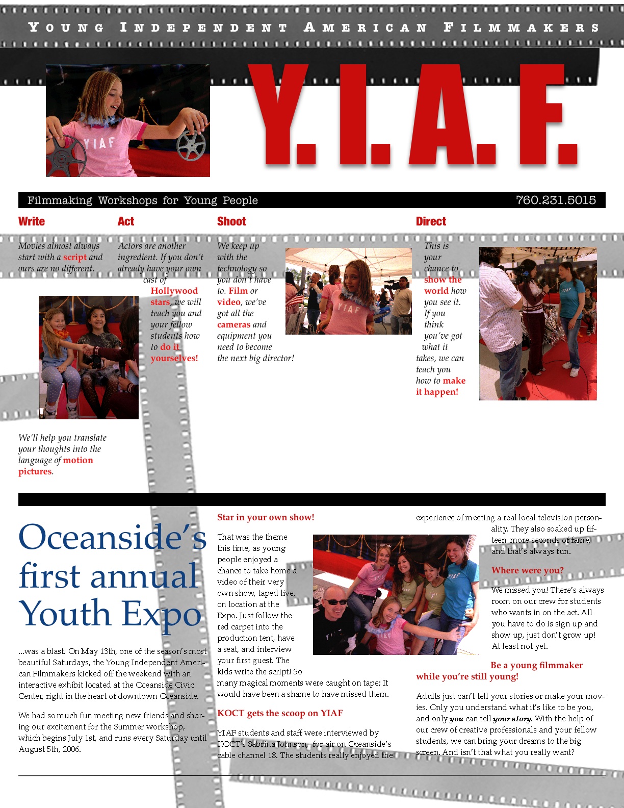 The award winning science fiction feature “The Vortex” was written and directed by YIAF student Drew Sherwood, age 12. This film won the Grand Prize at the First Night Escondido Film Festival 2007, as well as the Best Student Film and People’s Choice awards at the Carlsbad Environmental Film Festival 2007. This is Drew’s first attempt at writing, directing, and acting in the same project. We are extremely proud of him, and all of our students and volunteers who helped bring his dream to the screen.